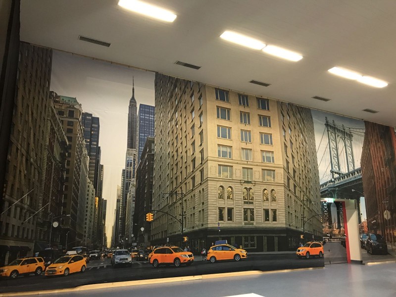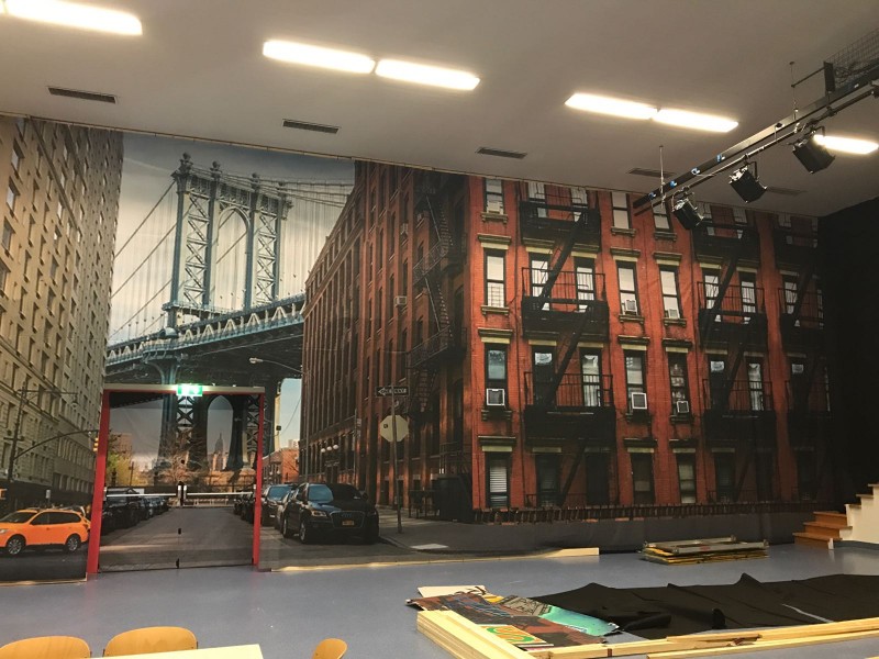 In einer Schweizer Tanzschule haben wir die Bühnenwand mit einem Vlies im New York-Look gestaltet.