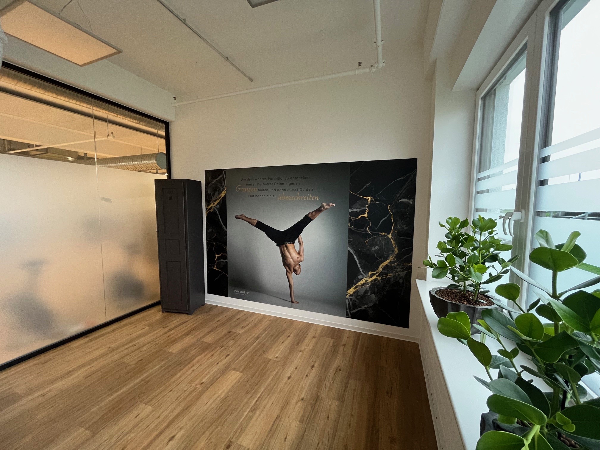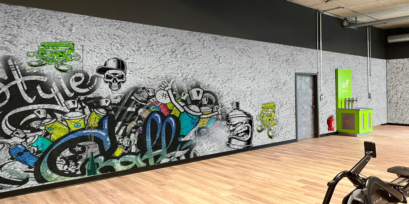 Dynamisches Fitnessstudio mit Akustikvlies-Wand in Graffiti-Art und Beton-Optik