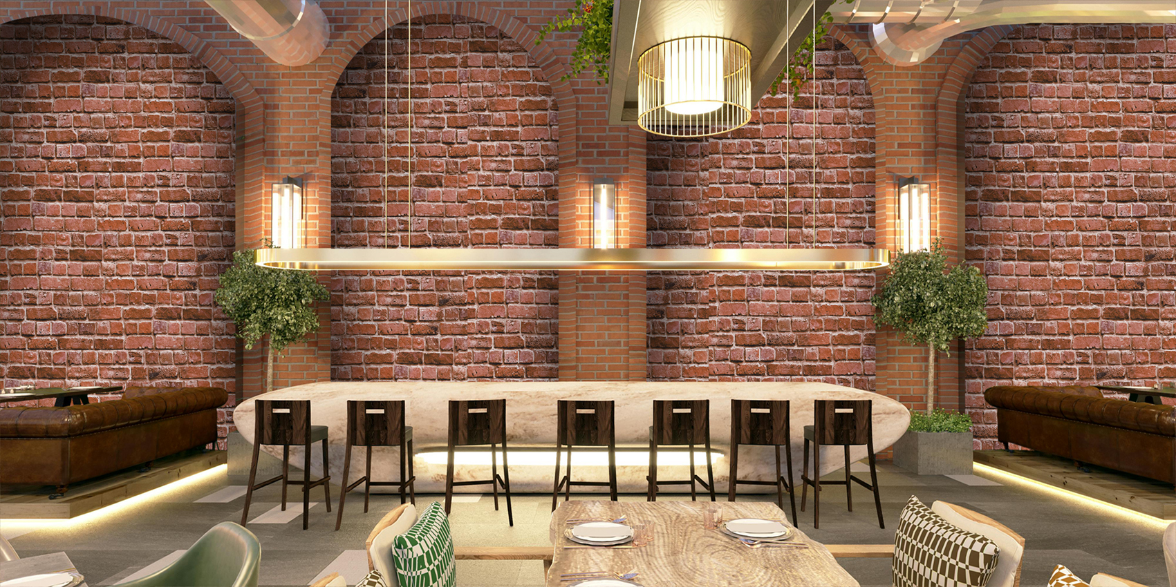 Atmosphärische Bar mit Akustikvlies-Wand in Backstein-Optik